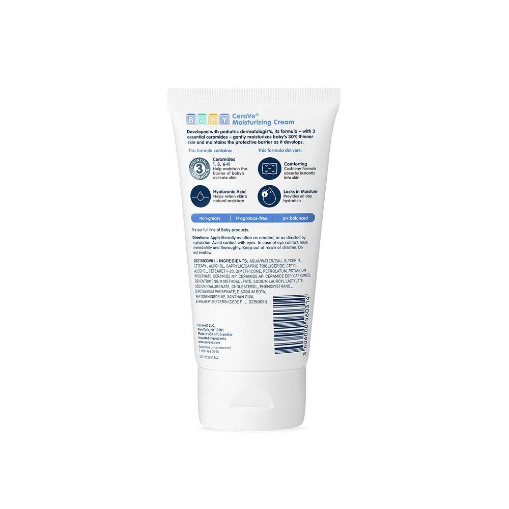 CeraVe Baby Moisturizing Cream is developed with pediatric dermatologists to provide comforting all-day moisture, which is important for baby’s skin. Our baby cream formula has three essential ceramides that help maintain the skin’s natural protective barrier in addition to ingredients like fatty acids and cholesterol pediatric dermatologists recommend. Formulated to deliver up to 24 hours of moisture, our fragrance-free, paraben-free and dye-free baby cream formula provides your baby’s skin with gentle hydration.