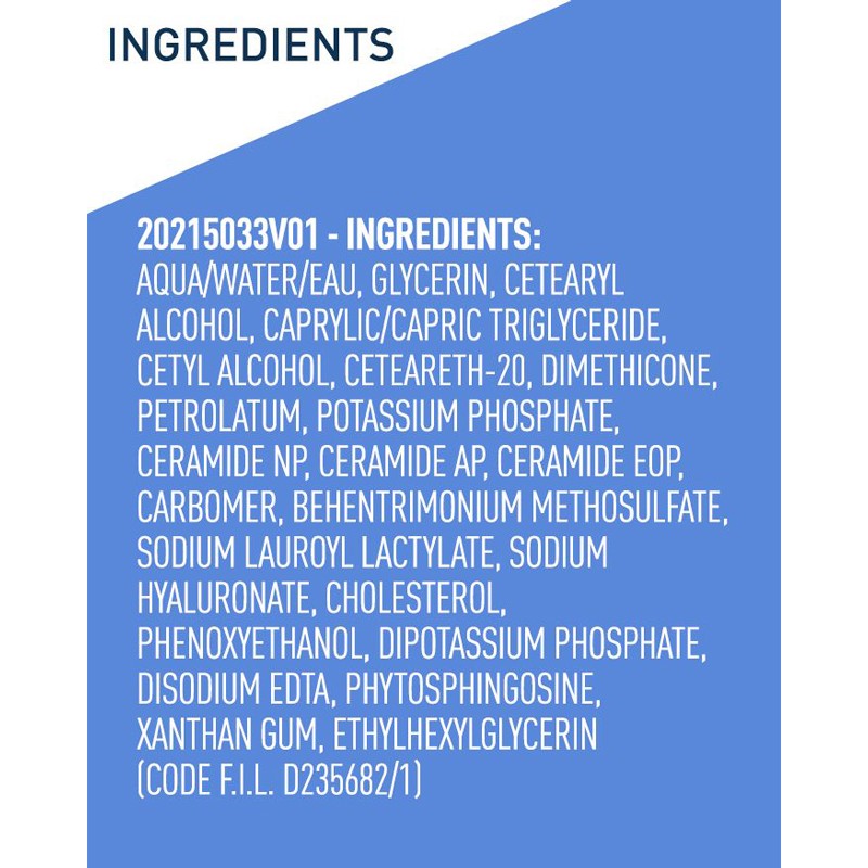 AQUA / WATER / EAU, GLYCERIN, CETEARYL ALCOHOL, CAPRYLIC/CAPRIC TRIGLYCERIDE, CETYL ALCOHOL, CETEARETH-20, DIMETHICONE, PETROLATUM, POTASSIUM PHOSPHATE, CERAMIDE NP, CERAMIDE AP, CERAMIDE EOP CARBOMER, BEHENTRIMONIUM METHOSULFATE, SODIUM LAUROYL LACTYLATE, SODIUM HYALURONATE, CHOLESTEROL, PHENOXYETHANOL, DIPOTASSIUM PHOSPHATE, DISODIUM EDTA, PHYTOSPHINGOSINE, XANTHAN GUM, ETHYLHEXYLGLYCERIN