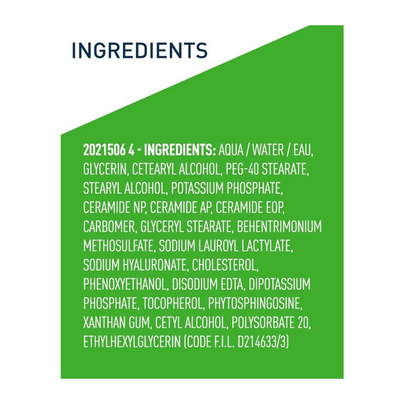 AQUA / WATER / EAU, GLYCERIN, CETEARYL ALCOHOL, PEG-40 STEARATE, STEARYL ALCOHOL, POTASSIUM PHOSPHATE, CERAMIDE NP, CERAMIDE AP, CERAMIDE EOP, CARBOMER, GLYCERYL STEARATE, BEHENTRIMONIUM METHOSULFATE, SODIUM LAUROYL LACTYLATE, SODIUM HYALURONATE, CHOLESTEROL, PHENOXYETHANOL, DISODIUM EDTA, DIPOTASSIUM PHOSPHATE, TOCOPHEROL, PHYTOSPHINGOSINE, XANTHAN GUM, CETYL ALCOHOL, POLYSORBATE 20, ETHYLHEXYLGLYCERIN