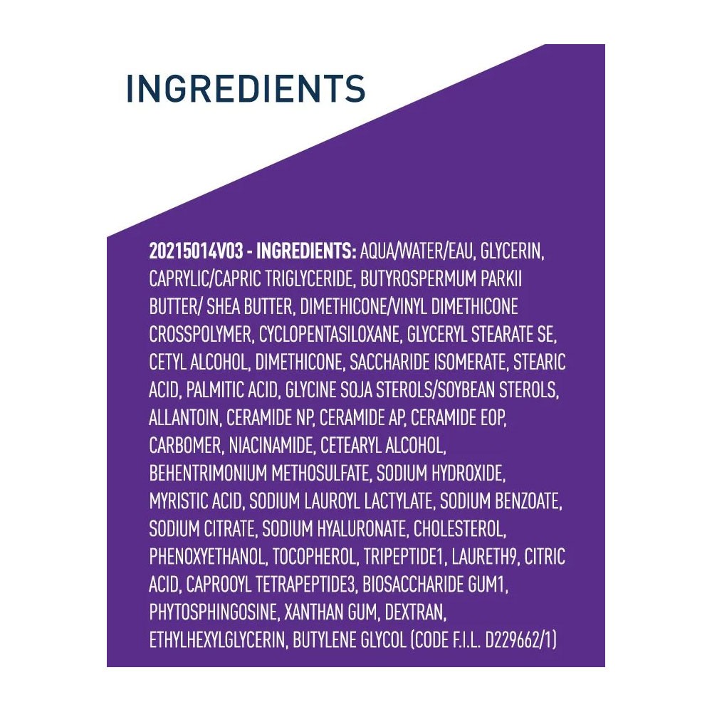 AQUA / WATER / EAU, GLYCERIN, CAPRYLIC/CAPRIC TRIGLYCERIDE, BUTYROSPERMUM PARKII BUTTER / SHEA BUTTER, DIMETHICONE/VINYL DIMETHICONE CROSSPOLYMER, CYCLOPENTASILOXANE, GLYCERYL STEARATE SE, CETYL ALCOHOL, DIMETHICONE, SACCHARIDE ISOMERATE, STEARIC ACID, PALMITIC ACID, GLYCINE SOJA STEROLS / SOYBEAN STEROLS, ALLANTOIN, CERAMIDE NP, CERAMIDE AP, CERAMIDE EOP, CARBOMER, NIACINAMIDE, CETEARYL ALCOHOL, BEHENTRIMONIUM METHOSULFATE, SODIUM HYDROXIDE, MYRISTIC ACID, SODIUM LAUROYL LACTYLATE, SODIUM BENZOATE, SODIUM CITRATE, SODIUM HYALURONATE, CHOLESTEROL, PHENOXYETHANOL, TOCOPHEROL, TRIPEPTIDE-1, LAURETH-9, CITRIC ACID, CAPROOYL TETRAPEPTIDE-3, BIOSACCHARIDE GUM-1, PHYTOSPHINGOSINE, XANTHAN GUM, DEXTRAN, ETHYLHEXYLGLYCERIN, BUTYLENE GLYCOL