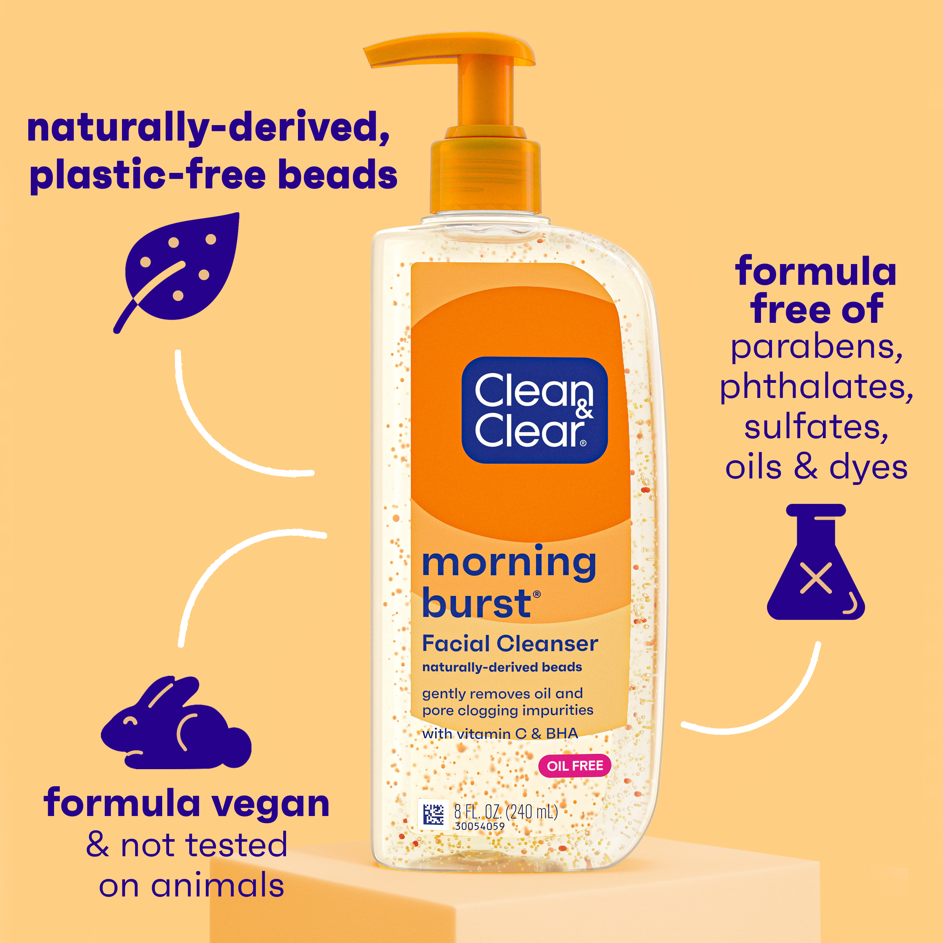 Clean & Clear Oil-Free Morning Burst Facial Cleanser with Vitamin C and BHA gently cleanses, exfoliates, and nourishes facial skin. Wake up with this nourishing facial cleanser that gently removes oil and pore clogging impurities. Its oil-free formula is made with Vitamin C and BHA, and designed with MoodScentz™ technology, connecting the power of scent and mood to delight your senses. The gentle, yet effective vegan formula of the nourishing facial cleanser is free of parabens, phthalates, sulfates, oils, and dyes and is not tested on animals. Suitable for everyday use, this foaming facial cleanser can be used as part of your daily morning skincare routine and is ideal for normal skin. To use, wet face, gently massage your face with the cleanser, and rinse thoroughly. Nourishing Morning Burst Facial Cleanser from Clean & Clear in recyclable bottle made from 50% recycled plastic.