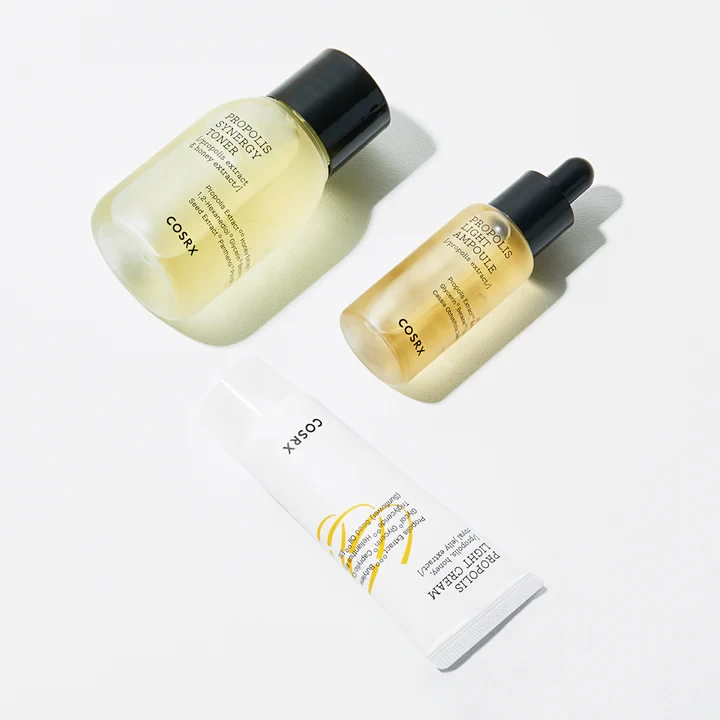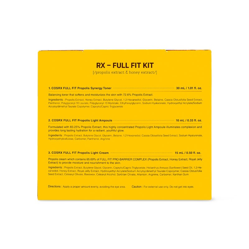 Valid within 3 days of registrationGet your hands on COSRX Full fit Propolis' three refreshing essentials, all in one place. Uniting travel-friendly sizes of Full Fit Propolis Light Ampoule, Full Fit Propolis Light Cream and Full Fit Propolis Synergy Toner, COSRX Honey Glow Kit Propolis Trial Kit is the perfect introduction to this collection. Ready, set… glow!