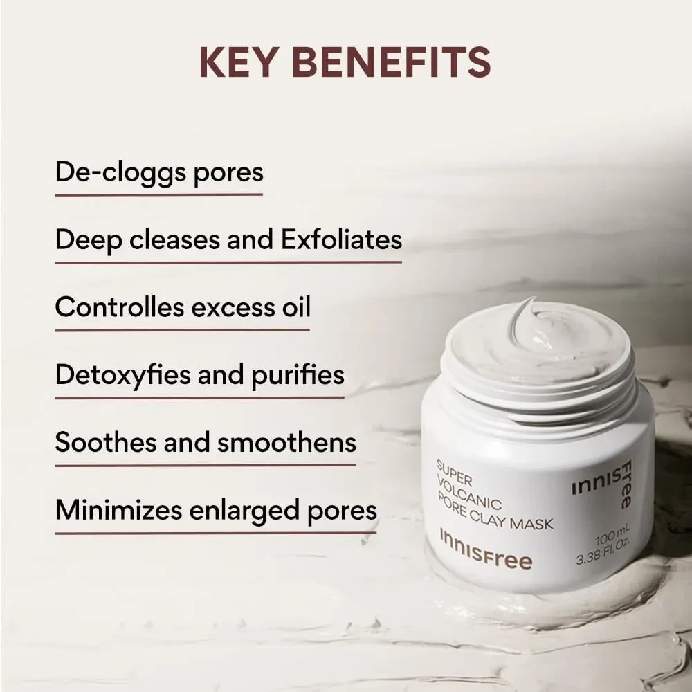 Innisfree Super Volcanic Pore Clay Mask contains super volcanic cluster capsules, which powerfully adsorbs sebum to intensively resolve pore concerns.
