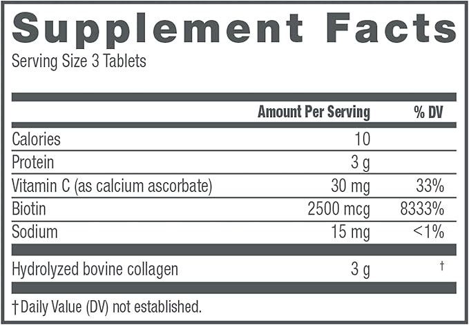 Calories, Protein, Vitamin C (as Calcium Ascorbate), Biotin, Hydrolyzed Bovine Collagen, Vegetable Magnesium Stearate.