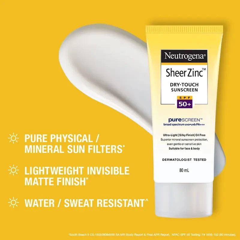 Neutrogena Sheer Zinc Sunscreen Lotion Broad Spectrum SPF 50+ is a mineral sunscreen that features our breakthrough Purescreen naturally-sourced 100% zinc oxide technology. This gentle formula delivers superior broad spectrum protection against burning UVB and aging UVA rays. Plus, it's mild even on sensitive skin, and it's free of fragrance, parabens, phthalates, dyes, and irritating chemicals.