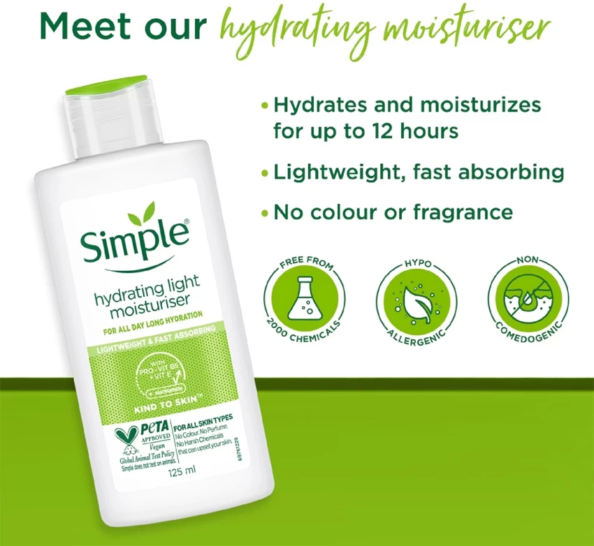 Valid within 3 days of registrationSimple Kind to Skin Hydrating Light Moisturiser provides care with a light feel on skin, leaves skin feeling soft, smooth and perfectly hydrated for up to 12 hours.